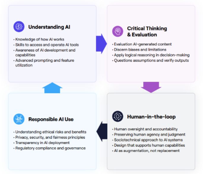 - Critical thinking and evaluation involve the ability to evaluate AI-generated content, discern biases and apply logical reasoning.