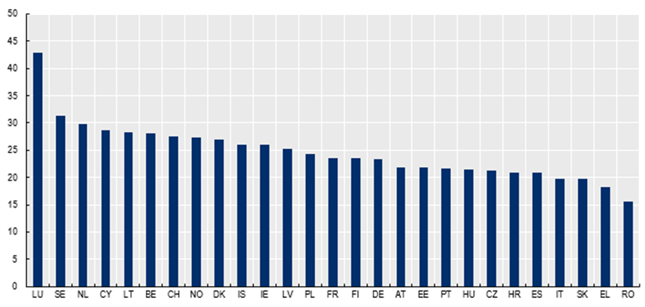 Skills that require collaboration with colleagues, originality, and experience with basic office tools have seen the most significant increase in demand in occupations highly exposed to AI. Originality constitutes a sub-grouping of cognitive skills that has experienced the greatest rise in demand. It comprises “creativity” and “developing new ideas.” On average, the share of high exposure vacancies demanding skills related to originality has increased from 25% to 33% between the base and end years (Figure XXX). The most significant increases occurred in Sweden, France, and Belgium.
