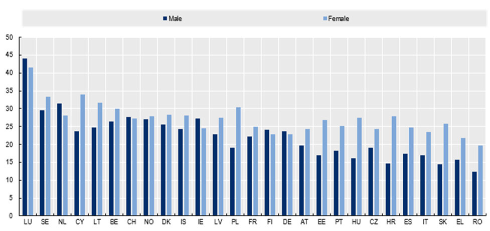 The share of male and female employment, respectively, in occupations highly exposed to AI